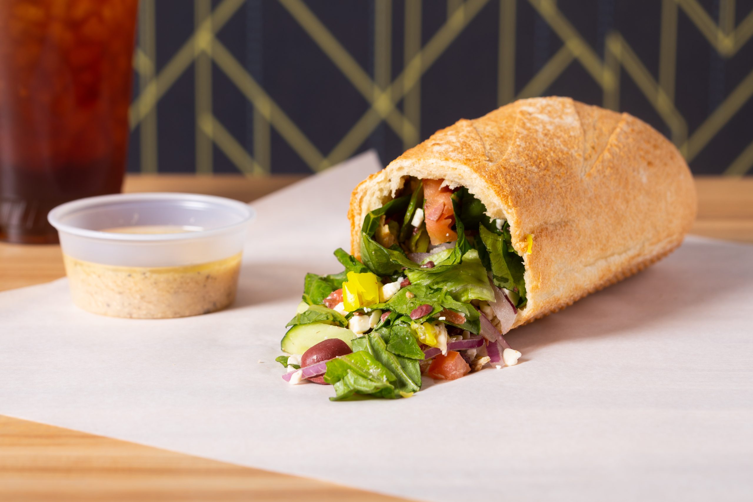 Bread Zeppelin signature stuffed baguette filled with fresh chopped salad beside dipping sauce cup