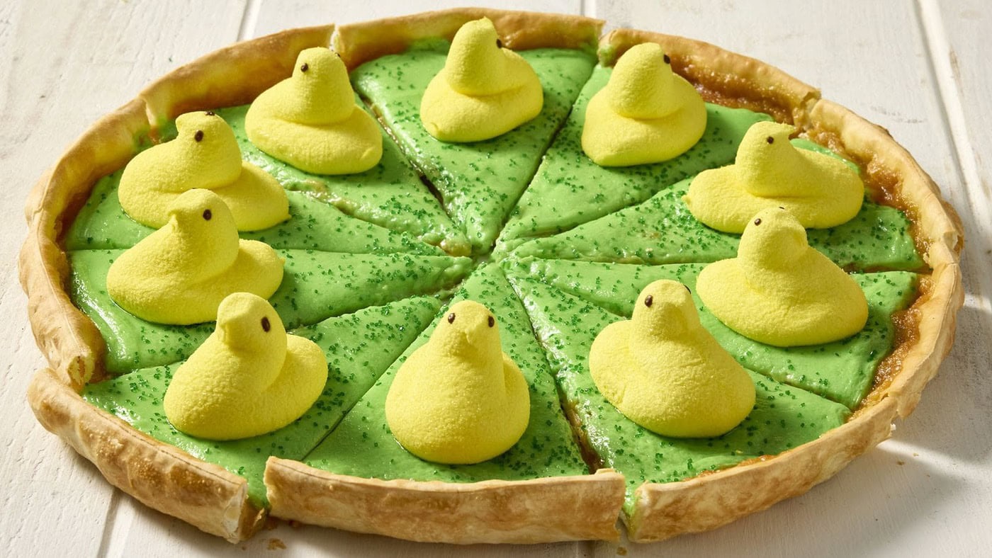 Now available at participating locations through April 20th, the Peeps Pizzert takes Pizza Inn’s famous dessert pizza and gives it a pastel-hued upgrade. The new treat features a rich Bavarian cream base, a lineup of 10 classic yellow Peeps Chicks, and a festive sprinkle of green “Easter grass” sugar crystals. This is a whimsical nod to springtime baskets and candy hunts.